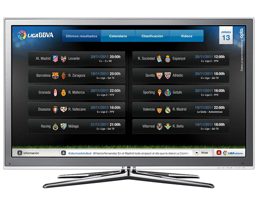 The Spanish premier football league LigaBBVA launched an internet TV application early 2012 to provide weekly match fixture information and latest score tables to millions of online supporters. While this proved to be successful LigaBBVA felt their fans wanted more and commissioned a branded Android app that would act as a personal remote control to the TV app.