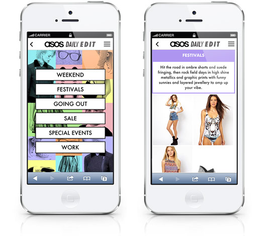 nimbletank was tasked with designing and building an engagement experience that would generated a ‘buzz’ amongst ASOS fans whilst also providing useful and interesting content that consumers would repeatedly visit on a daily basis. The result was ‘The Daily Edit’, built using innovative design and technology to create a wow factor whilst making shopping easy for the mobile ASOS customer. Separated into six categories, 'The Daily Edit' offers a bite sized chunk of the best of ASOS womenswear literally at customers' fingertips for wherever the mood/trend takes them.